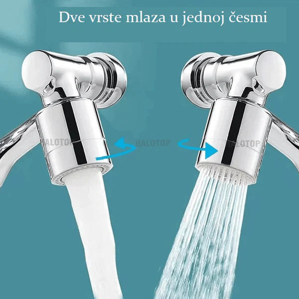 Ovaj multifunkcionalni nastavak za slavinu ima dve vrste mlaza. Prvi mlaz je lagan i odličan je za jutarnje umivanje, pranje ruku.. Drugi tip mlaza jeste jak i oštar mlaz koji je pod pritiskom i odličan je za pranje sudova, čišćenje sudopere ili umivaonika. Sperite svu nečistoću lako i bez muke. Takođe u sebi poseduje filter koji filtrira vašu vodu. napravljen od čelika i ABS-a. Spoljni i unutrašnji navoj. Dimenzije: 9.5x3x2.5cm. Pogodan za svaku česmu!