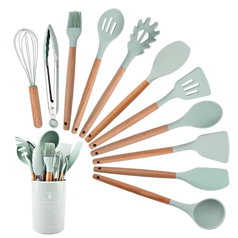 Naš silikonski set posuđa napravljen od silikonske glave visoke otpornosti na toplinu za hranu kako bi se spriječilo topljenje posude kada se zagrije. Za razliku od lako topljivih plastičnih i gumenih uređaja, silikonski pribor neće oštetiti posuđe, kao što su lonci i tiganji sa neprijanjajućim slojem.