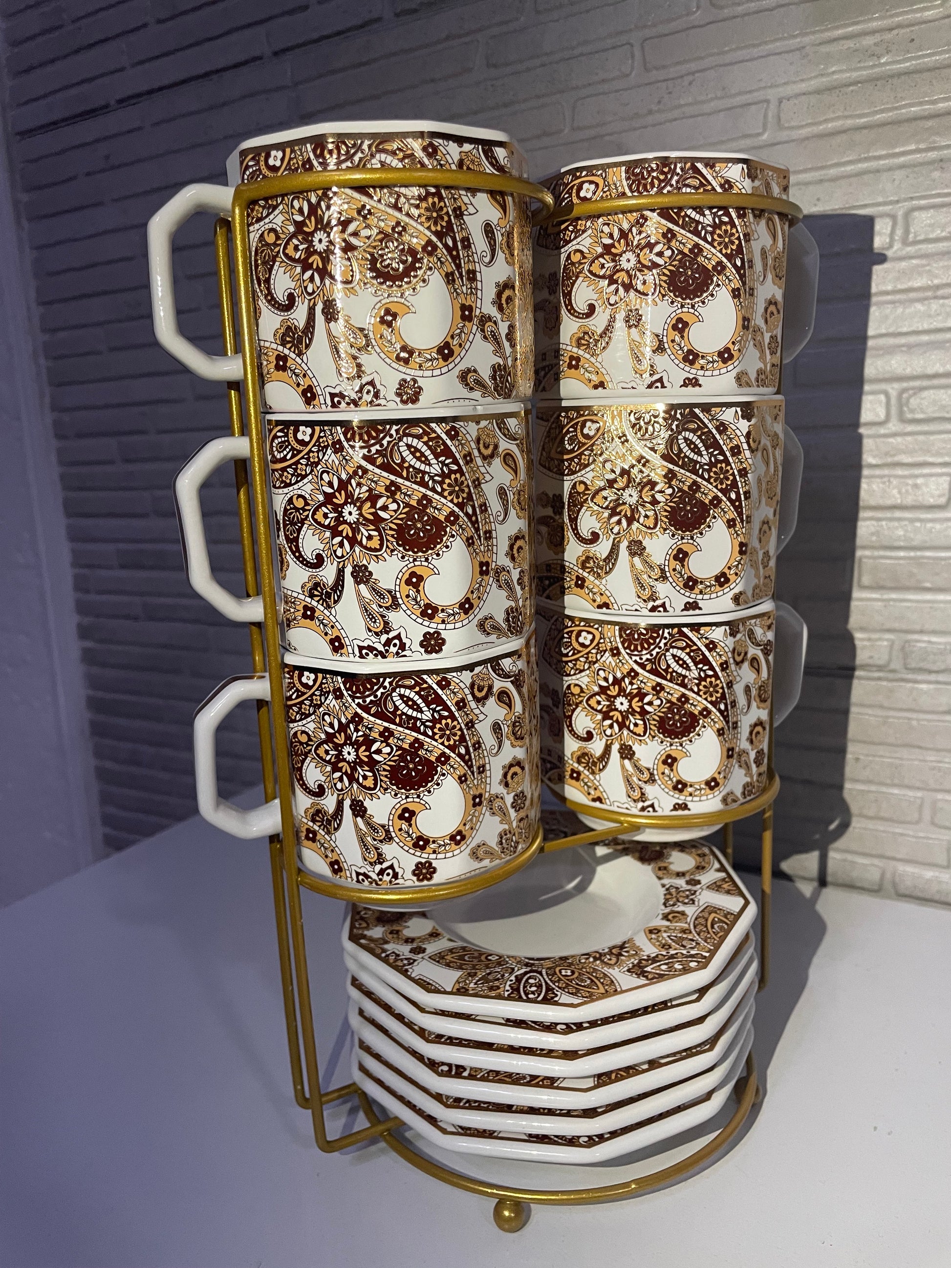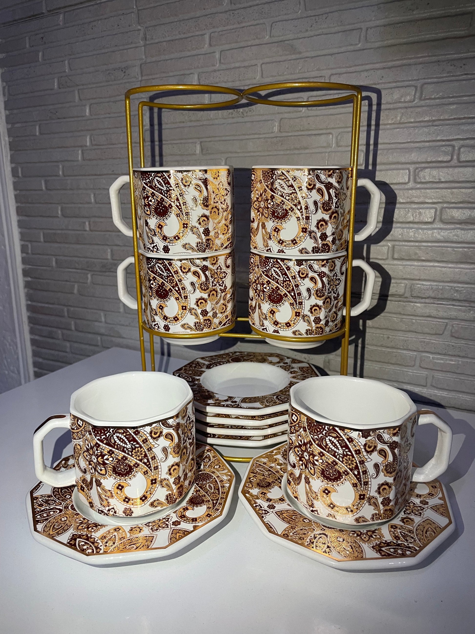 Uživajte u posebnim trenucima uz ovaj prelijepi set šoljica sa tanjirićima, ukrašen bogatim zlatnim i braon ornamentima.